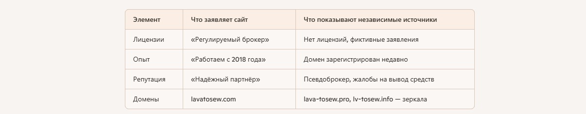 В Казахстане и других странах независимые источники относят Lavatosew и его зеркала (lava-tosew.pro, lv-tosew.info) к псевдоброкерам, систематически обманывающим клиентов. Анализ публичных данных и отзывы пострадавших показывают типичные признаки скама. Это отсутствие лицензий, фальшивые регистрационные данные, навязывание дополнительных сборов и блокировка вывода средств. Ниже подробный разбор признаков мошенничества и рекомендаций для инвесторов. Вот десять признаков классического лжеброкера, работающего по мошеннической схеме: